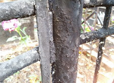 На могиле в первую очередь мы занялись оградой. Обожгли старую краску. В этот раз обжиг занял больше времени. Пришлось жечь ее в два захода.