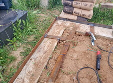 Для начала мы крепим к периметру цоколя металлическую планку, которая послужит бортом для брусчатки. Для придания необходимой жёсткости навариваем на железо необходимые элементы, тем самым надёжно закрепляя планку.
