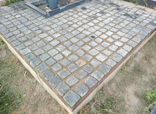 Заранее просыпав площадь места захоронения пескобетонной смесью начинаем строгими рядами укладывать брусчатку.